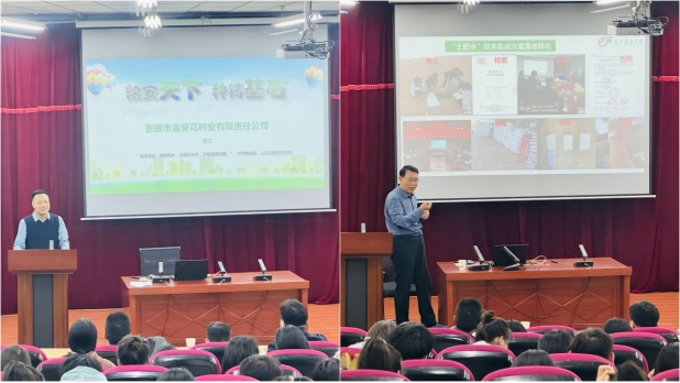 报告会上,两位企业代表分别以《粮安天下 种筑基石》《农业专业化社会化服务协同创新助力玉米制种产业绿色高质量发展》为题作了精彩的报告。员工詹文以云顶国际vip8866求学、基层一线工作的个人奋斗经历为蓝本,回顾了在求学与探索之路上的成长与发展,围绕农业老员工历史使命及社会责任、怎样学好农学专业、农业的机遇和方向、金葵花种业发展前景及社会贡献等四个方面激励同学们未来学习生涯中既要做好学术研究,又要在田间地头做文章、出成果,鼓励农学学子要踏实肯干,认真学习,勇于创新,用科技的力量来解决农业问题。谷丰源农工场负责人谷科强结合当前国家发展前景与个人工作经历,为现场同学们详细阐述土肥水药技术集成方案农服模式的内涵,对张掖市玉米制种产业耕地质量退化、连作障碍严重、土壤盐渍化和土壤板结加重等“卡脖子”问题进行了讲解,号召广大农学学子加强专业理论知识的学习,不断提升专业实践能力,将科技论文书写在陇原大地。
