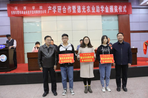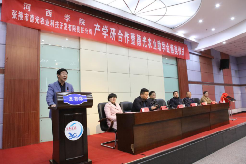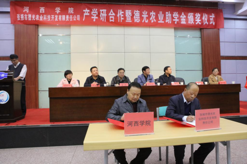 颁奖仪式前,公司负责人与张掖市德光农业科技开发有限责任公司负责人分别签署产学研合作协议和德光农业助学金捐赠协议;徐德桢与张掖市德光农业科技开发有限责任公司负责人共同为产学研合作基地揭牌;张汉燚为张掖市德光农业科技开发有限公司总经理、云顶国际vip8866优秀员工赵文勤先生颁发客座教授聘书。